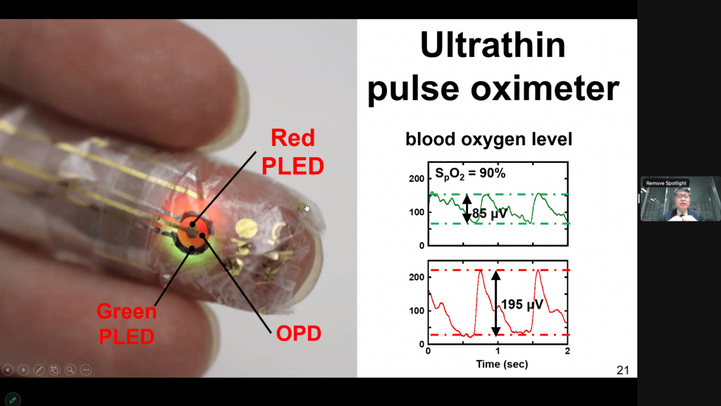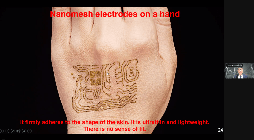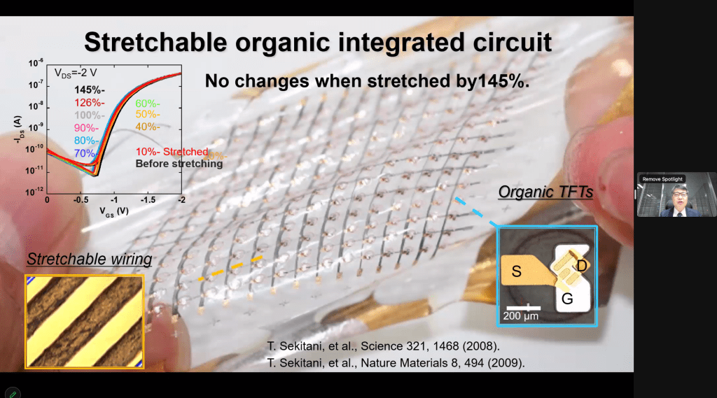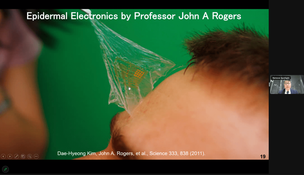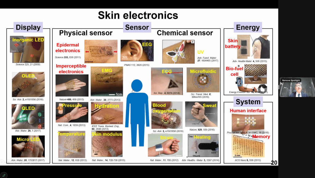 Abstract: Flexible electronics continues to expand its application from robotics to human, with increased attention for its contribution to personalized healthcare. Attempts to replicate the function of human skin have resulted in the development of electronic skins for robots that simultaneously detect pressure and thermal distribution. Improvement in conformability allowed the application of electronic skin to human bodies, reaching a point where ultrathin semiconductor membrane can be directly laminated onto the skin. The intimate and conformal integration of electronics with the human skin not only facilitates continuous health monitoring but also holds immense potential for advancing wearable technologies. Seamless integration of electronics with the human skin enables non-invasive measurement of health conditions and human activities in natural settings. In my presentation, I will examine recent advancements in stretchable thin-film electronics, exploring how they contribute to the development of electronic skins and their capacity to enhance wearables. By addressing key challenges and highlighting prospects, I hope to shed light on how electronic skins can revolutionize wearables, offering interactive reinforcement between technology and the human body for improved healthcare monitoring.