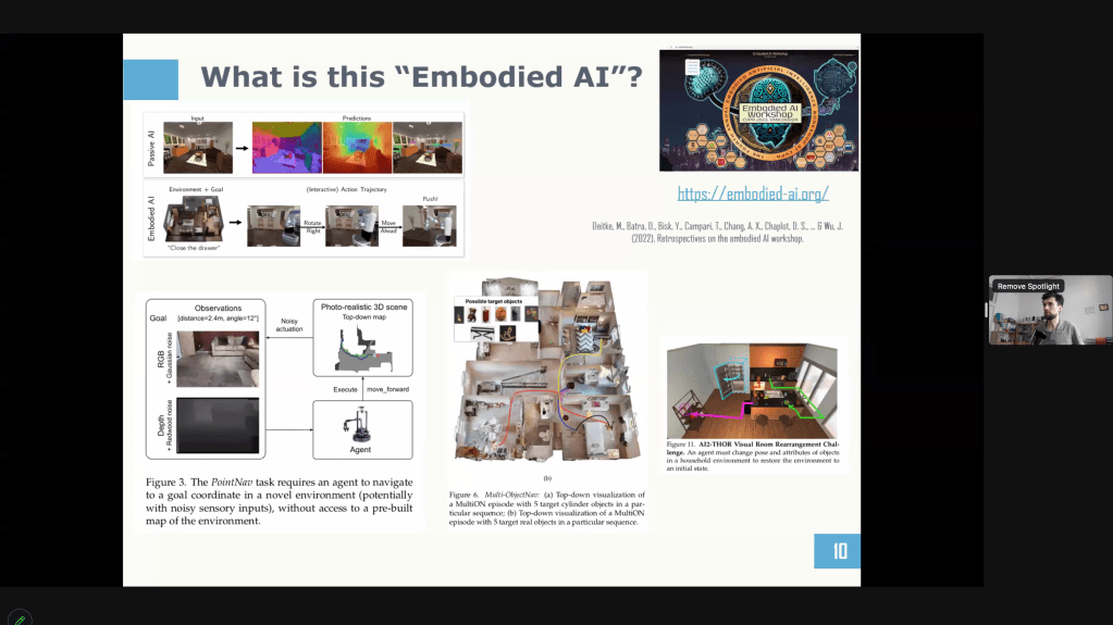 - Abstract: There is a growing interest in Embodied AI in the machine learning, deep learning, computer vision, and robotics communities. The rapid advances in this field (e.g., https://www.deepmind.com/blog/scaling-up-learning-across-many-different-robot-types) seem to deny the fundamentals of embodied cognition, namely that intelligence is constitutively shaped by the body it resides in and hence different robot bodies should have different “brains”. Applying Large Language Models (LLMs) to robotics seems inherently prone to the grounding problem – how can a model that has “read the whole Internet” be able to meaningfully command a mobile robot or a robot arm robot with their completely different sensorimotor characteristics and hence affordances?