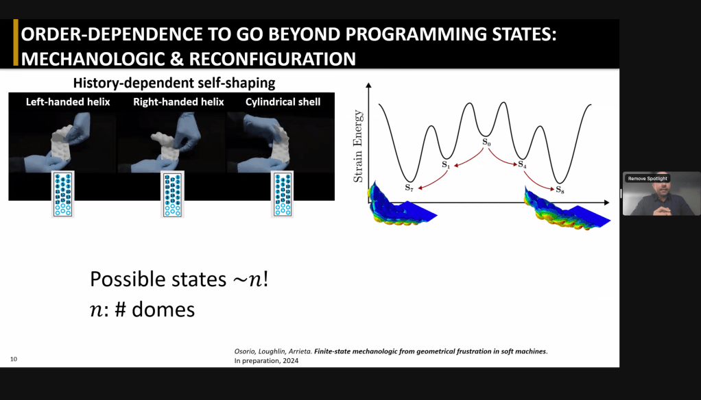 - Abstract: Recently, metamaterials have been used to process information by exploiting their ability to change shape and stiffness, conform to different bodies, and complement binary-based mechanical computing by introducing concurrent information processing and memory formation, similar to the processes in physical reservoir computers. A specific class of metamaterials featuring dome-shaped units exhibit order-dependent deflections (non-Abelian behavior) that are reminiscent of spin glasses, a type of condensed matter exhibiting strong state degeneracy (multiple energy minima) enabling in-material memory and computation. This state degeneracy stems from the inability to simultaneously minimize all the local (mechanical) interactions due to deformation incompatibilities or constraints, a phenomenon known as geometrical frustration. Appropriate design of geometrical frustration allows for accommodating these local incompatibilities, whereby the accumulated collective deflections result in substantial three-dimensional reshaping while maintaining low local strains. In this talk, we show how exploiting the interplay between geometry and constraints allows for leveraging the resulting strong multistability to embody intelligence into robotic systems purely from mechanics. We illustrate intelligence from geometrical frustration via pneumatically actuated soft grippers with encoded multiple accessible, stable states that offer a route to open-loop shape reconfiguration. Informed by the mechanics of multistable metamaterials, we design coexisting states resembling different actuation modes in soft manipulators, including grasping, power grasping, and twisting. We achieve this by leveraging distinct path-dependent activation sequences to access desired coexisting states informed by the interaction of the dome-shape units. We demonstrate how to describe this system as a temporal finite state machine that yields different output shapes depending on the recorded sequence. Our strategy offers a new route for controlling soft robots, exploiting the nonlinear mechanics of multistable structures to the designer’s advantage, thus opening the avenue for embodying finite-state machine-based control strategies without closed-loop control for soft structures.