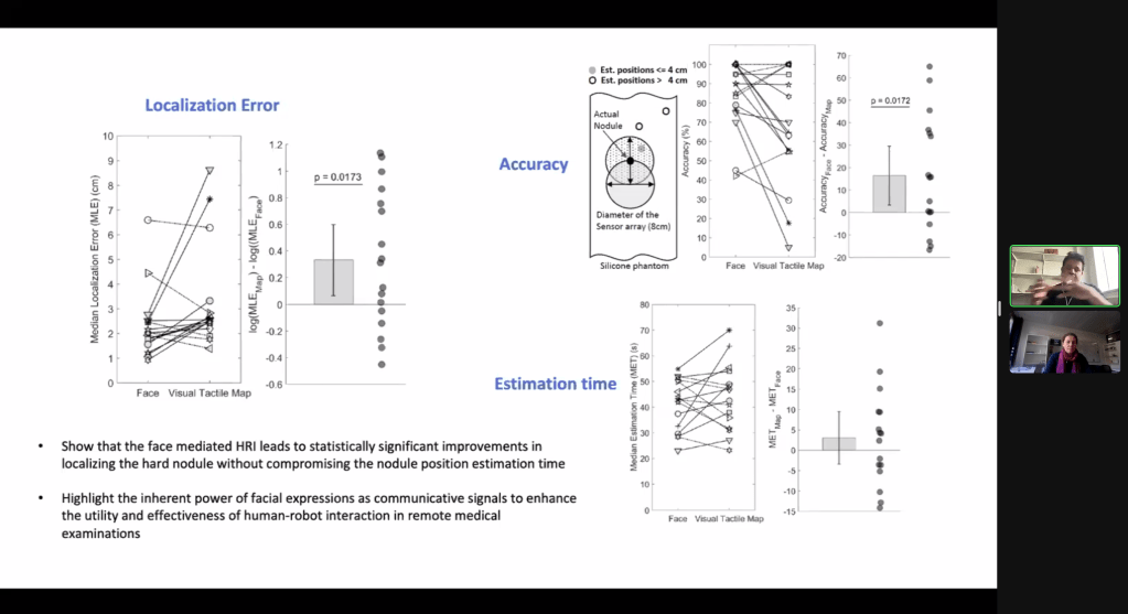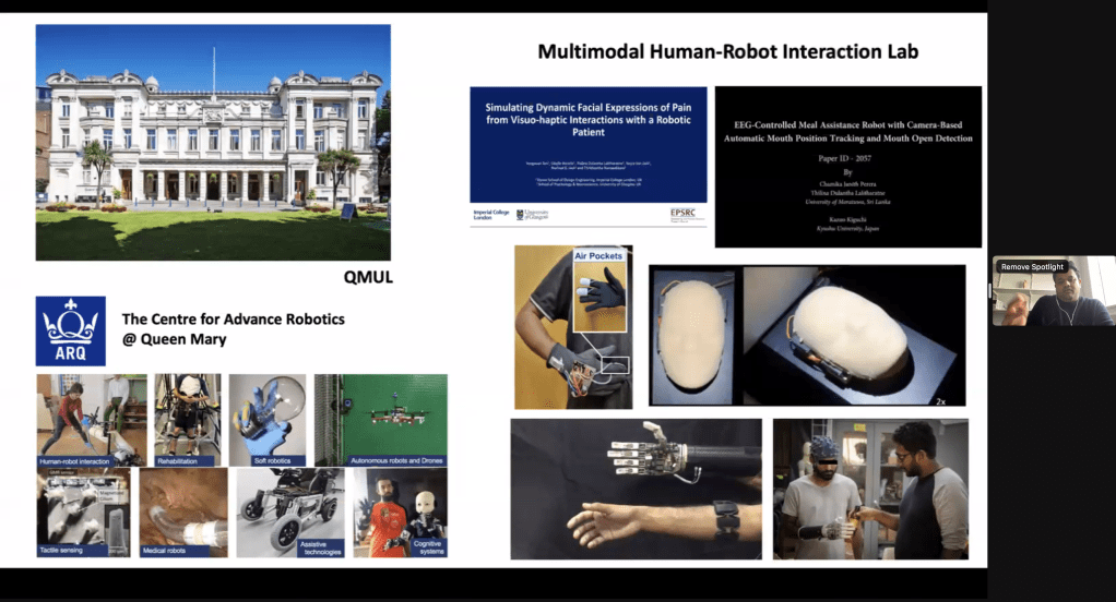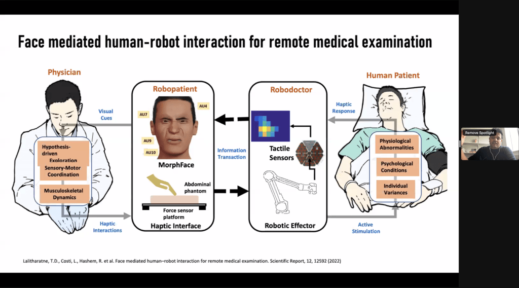 - Abstract: Remote examinations and teleoperation offer numerous advantages across various domains, including remote patient diagnoses, minimally invasive robotic surgery, and teleoperating in extreme environments like nuclear decommissioning. These applications require real-time multimodal sensing and feedback, encompassing visual, haptic, and auditory signals, which are vital for effective diagnosis and control. In my talk, I will be particularly focused on use cases around remote patient diagnosis that enable patients in regions with limited access to specialized medical professionals, allowing them access to doctors for early diagnosis and treatment through new multimodal HRIs.