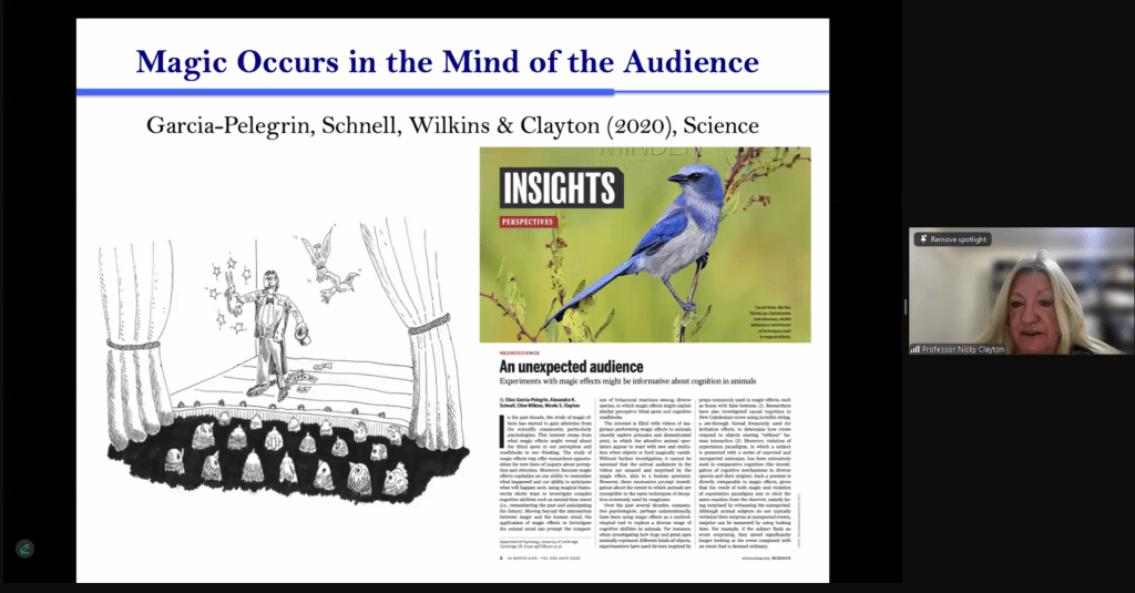 Abstract: Cognitive illusions reveal a number of fascinating features about the psychology and biology of the mind; not just perception and attention but also mental time travel, the ability to remember the past and anticipate the future. Magic effects also illuminate some important things about Theory of Mind, the ability to assess the thoughts of others, both on the part of the audience and on the part of the magician. In this talk I will evaluate the extent to which corvids, known for their impressive cognitive abilities, exploit such principles in their natural caching behaviour~ i.e., their ability to hide food and other valuable objects from the prying eyes of their competitors and protect their caches from being pilfered. I will also investigate whether and to what extent these birds are fooled by human magic effects. Finally, I will discuss what this approach might reveal about embodiment and specifically the intersection between the ability to manually produce an action and the ability to anticipate the actions of others: for sleight of hand magic capitalises on the observer’s predictions of specific biomechanical movements, particularly those of the fingers and thumbs.