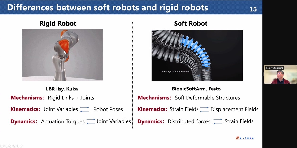 - Abstract: Conventional robots using rigid structural elements and high-output motors have enabled great progress in automated assembly and manufacturing. An increasing number of robots need to interact safely with humans, manipulate soft and delicate objects or need to move in confined environments. Soft robotics allowing safe interaction with people and environment is a rapidly growing field as the robotic function can be directly created by using the concept of mechanical intelligence in soft materials. However, due to nonlinear large defamation and infinite degree-of-freedom of soft materials and structures, there are grand challenges in design, modeling, control and applications of soft robots. In this talk, I will give an overview of our recent development on design and control of pneumatical-actuated soft robots at SJTU, mainly focusing on soft prosthetic hand, sensing skin, modeling and control approaches. The presented works also demonstrate that the concept of soft robotics is with mechanical intelligence to simplify the design of bioinspired mechanisms and enable new opportunities to bridge the gap between robots and organisms