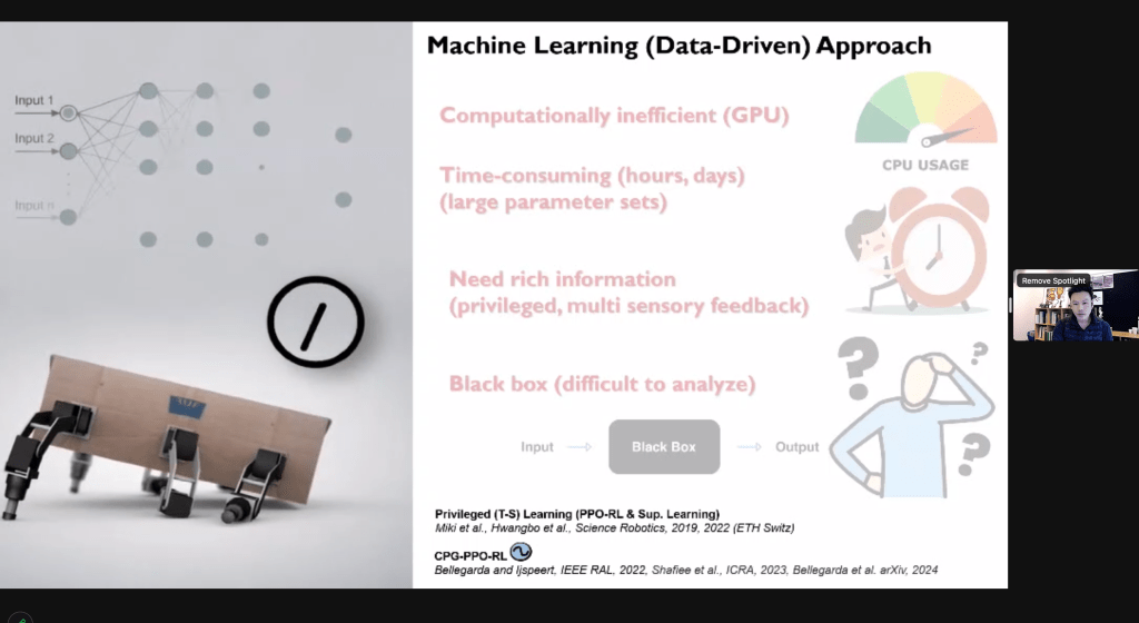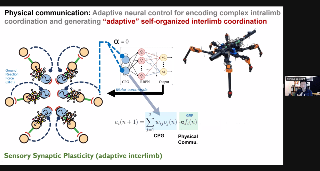 - Abstract: Animals exhibit versatile and elegant behaviors through adaptive intralimb and interlimb coordination. Their self-organized movements convey an impression of adaptability, robustness, and motor memory. However, replicating their adaptive coordination control mechanisms in artificial legged systems remains challenging. While attempts have been made to utilize machine learning for the task, this data-driven learning approach still demands substantial computational resources and extensive time for learning—ranging from hours to days or even weeks. In this talk, I will introduce embodied adaptive neural control, capable of emulating natural abilities by facilitating adaptive physical and neural communications. I will demonstrate how the integration of these two forms of communication through adaptive neural control can achieve rapid and robust self-organized locomotion within a few seconds. The introduced adaptive neural control architecture can also serve as a basis for developing “GEneral NEural control for Self-organIsed emergent behavior of legged/limbed Systems (GENESIS)”.