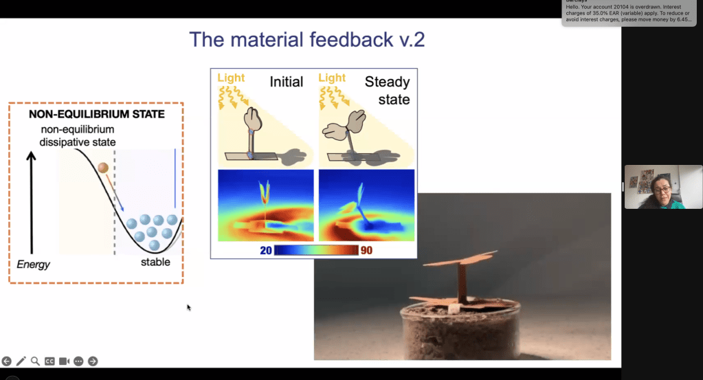 - Abstract: Conventional robots are controlled by feedback mechanisms that include the sensing of the environment and the response to the environment with appropriate sensors and electronic feedback mechanisms. The hardware and electronics needed to sustain the control in conventional robots do not comply with the agile, low-weight soft robot. On the other hand, soft robots can be controlled through other non-mechatronic mechanisms. Some chemical concepts can be used to achieve the sensing, actuation, and feedback required for autonomous motion in soft robots made from soft materials like polymers and hydrogels. Some examples of our simple, self-regulation plant robots will be presented here. These systems operate autonomously with (sun) light and can turn on and follow the source independently without outer control. In the first example, the robot is operated by optomechanical feedback. The control mechanism involves the appropriate geometrical arrangement of shape memory alloys and their reversible thermal contraction. In the second one, the reversible hydration/dehydration of water from hydrogels is used to build the feedback control in the system. Finally, it will be shown that the control can be tuned using some physical chemistry. ‘A pinch of salt’ can add to the hydrogel system’s embodied intelligence, expanding the versatility of control parameters.