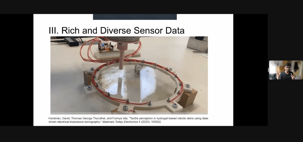 - Abstract: Integration of machine learning into traditional robotics systems is driving advancements in robot capabilities and autonomy. Soft robots typically exhibit more complex and nonlinear dynamics compared to their rigid counterparts, also posing several sensing challenges. Nevertheless, this talk presents the argument that learning-based approaches are even more suited for soft robotic systems, especially when it comes to complex interaction-based tasks. Arguments for this case are supported using observational data from the speaker’s prior work.