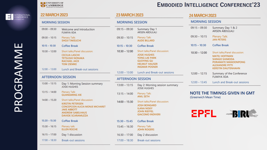 This free event brings together a wide range of speakers to discuss the many challenges and opportunities in Embodied Intelligence research! The conference is structured with a morning session and afternoon session each day to accommodate different time zones. Each session includes plenary talks, panel discussions (including flash talks by leading researchers), and breakout sessions as shown in the tentative programme here. While plenary and panel speakers are invitation-only, we solicit wider contributions in breakout sessions to facilitate more focused and technical discussions.